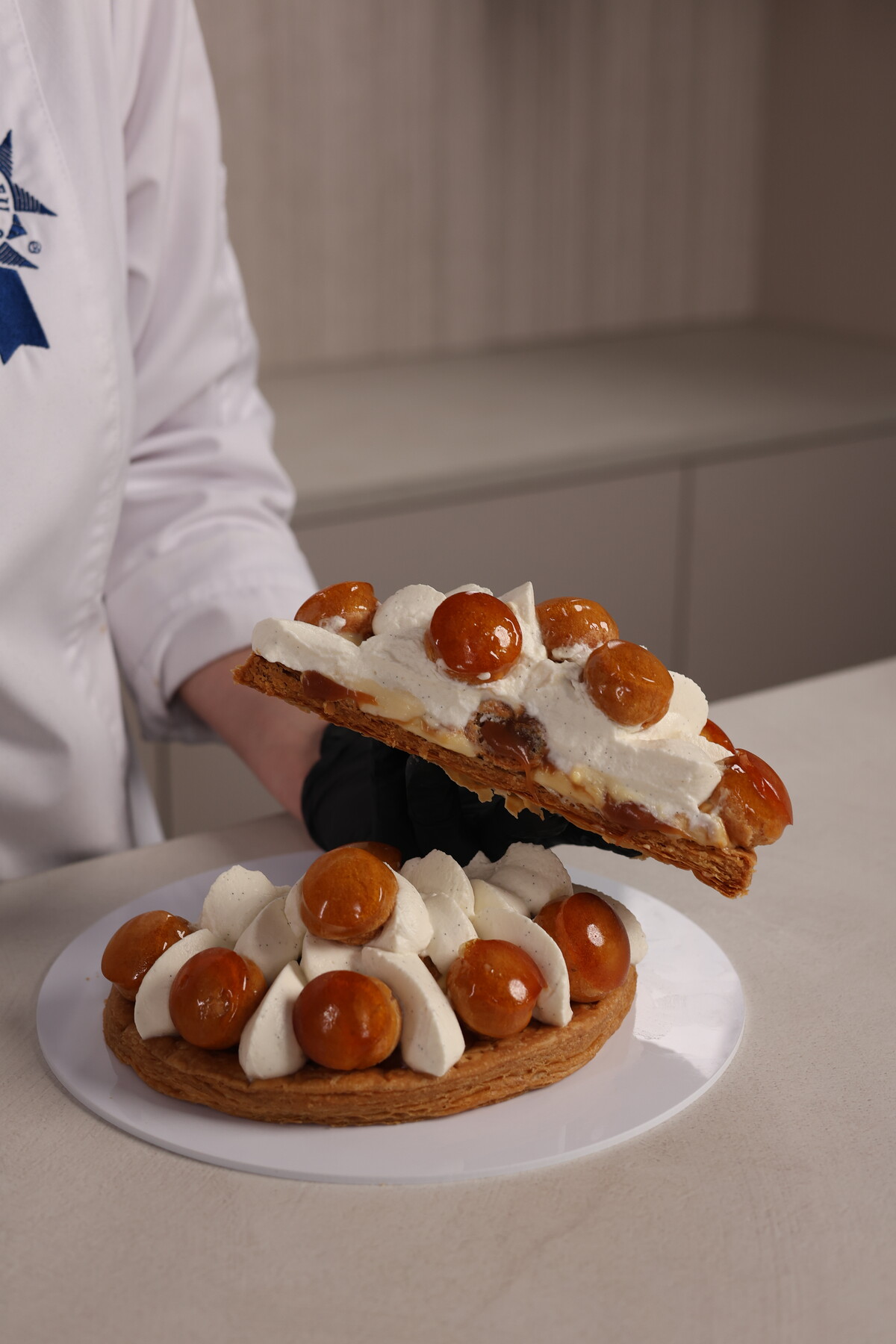 Слоеное тесто, заварное тесто для профитролей, ванильный заварной крем Патисьер, карамель, карамельная начинка, крем Шантильи